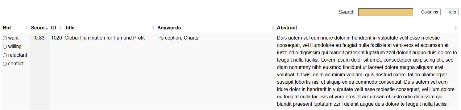PC members have a large number of papers to go through in the interface above and they often sort by the score column to get papers that best match their expertise or they use the search field to search for keywords. In the future there will also be features that allow PC members to filter by keywords they rated themselves highly on.